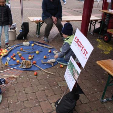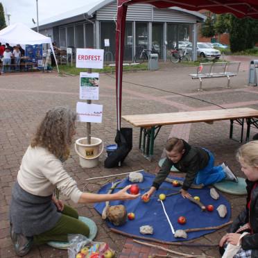 Wir von der Kunstschule Zinnober haben gemeinsam mit unseren Kolleg*innen der Kunstschule Lingen in zwei bereits existierende öffentliche Feste jeweils ein Erdfest integriert: einmal am 23. Juni in das Internationale Fest in Papenburg, an dem wir uns seit 25 Jahren beteiligen und tags darauf in das Welt-Kindertheater-Fest in Lingen. Zuvor hatten unsere Kunstschulen zwei Jahre lang in einem »ÄPfEL« genannten Programm künstlerisch mit Äpfeln geforscht (ÄPfEL bedeutet hier auch »Ästhetisches Programm für das Emsland«). Den Abschluss dieses Programms mit dem Erdfest zu verbinden war auch ein Aufruf zum Weitermachen.