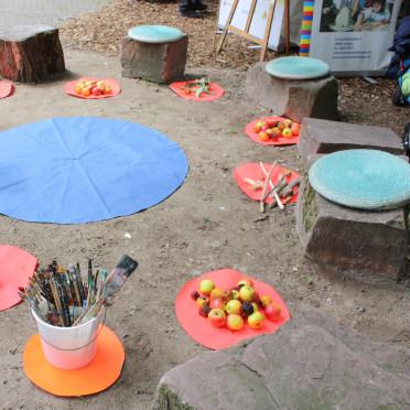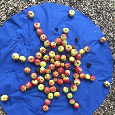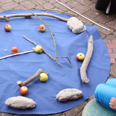 Zur eigenen Einstimmung bereiteten wir den Platz sehr sorgfältig und mit Bedacht vor: eine blaue, runde Decke in Anlehnung an unseren blauen Planeten, sortierte Naturhölzer, »Erde« in Form von Tonklumpen und »natürlich« Äpfel als Mitwirkende. Mehrere Sitzkissen, die zum Mitmachen einluden, wurden sehr schnell von den ersten Kindern mit fragenden Augen eingenommen. Und nun?