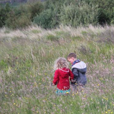 Und als der mild-warme, aber alles durchblasende Wind kurz nachließ, gingen wir raus, um ein Feuer zu entzünden. Birken, Hazel, Weiden und viel Schlehensträucher, Reste von der Winterarbeit waren zu einem haushohen Berg aufgeschichtet. Zu meinem Erstaunen, ließ sich das Holz trotz heftigem Wind gut entzünden, und rasch war der ganze Haufen von den Flammen erfasst. Wo solch ein Asthaufen im Jahr zuvor die ganze Nacht brannte und noch lange in den nächsten Tag hinein wärmte, sorgte der Orkan für ein kurzes, intensives Vergnügen. Die Kinder tollten auf der Blumenwiese, unsere Kleine spielte mit dem Hund, die Eltern redeten angeregt. Alle Gesichter glühten, von der Hitze des Feuers, dem Wind, dem Glück.